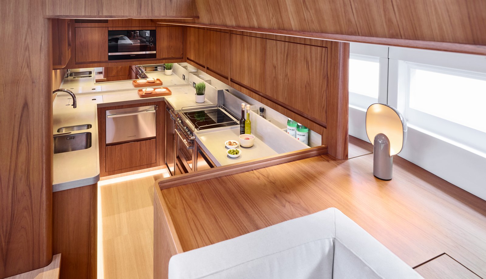 Beneath the range’s signature dual cockpit arrangement for ease of short-handed sail control and operation, there is an extra-large garage for super-sized tender. And to keep this space as bosun’s store only if required, there’s the option of a tender-well on the foredeck that further doubles as water filled tub or tabled leisure cockpit for foredeck drinks and dining. Sail control at the twin helm stations is finger-tip automated and the feel at the wheel delights with light, direct response.